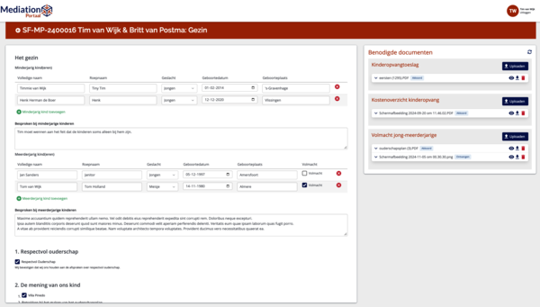 ✅ Efficiëntie voor de mediator – Tijdens de mediation bespreekt de mediator de door klanten ingevulde antwoorden en de bijbehorende documenten, die in de applicatie zichtbaar zijn onder het thema Gezin, waardoor het gesprek zich direct kan richten op de vraagstukken waar ouders nog mee kampen.