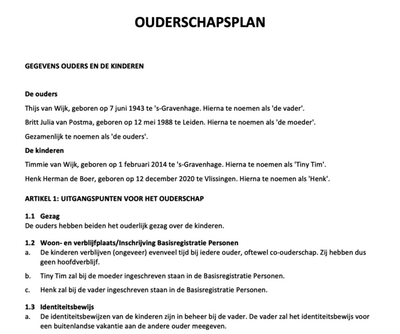 ✅ Automatisch gegenereerd Ouderschapsplan – Op basis van de antwoorden wordt een juridisch kloppend én inhoudelijk verrijkt Ouderschapsplan gegenereerd. Dit kan in PDF, of in Word, waarna het nog volledig aanpasbaar is aan gewenste toevoegingen die een mediator of de ouders willen maken.