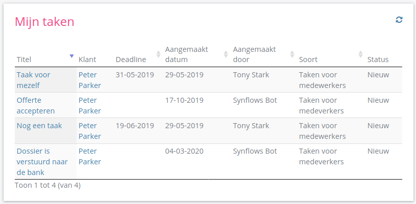 Binnen dit widget kunnen alle gegevens (klanten, dossiers, taken) op een compacte en interactieve manier worden weergeven. De velden binnen de tabellen zijn sorteerbaar en kunnen naar wens worden gefilterd. Tevens is er een mogelijkheid om te zoeken binnen de tabel.
