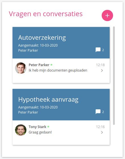 Ons document widget kan de documenten die relevant zijn voor uw klant op een vriendelijke manier weergeven, deze kunnen worden bekeken en worden gedownload. Daarnaast is er een mogelijkheid om documenten te uploaden.
